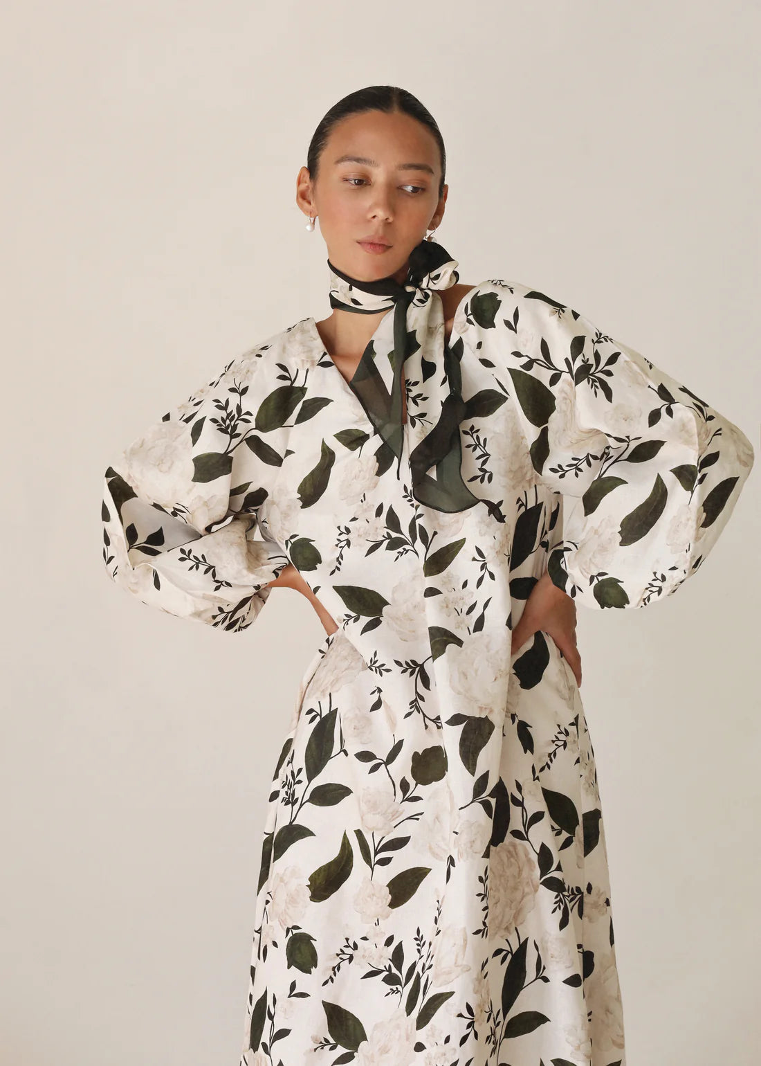 The Delphina dress is crafted from three flowing panels of linen that cascade elegantly to the floor. Exaggerated balloon sleeves are lined for volume, while a curved V-neckline with subtle gathers enhances the dramatic silhouette.