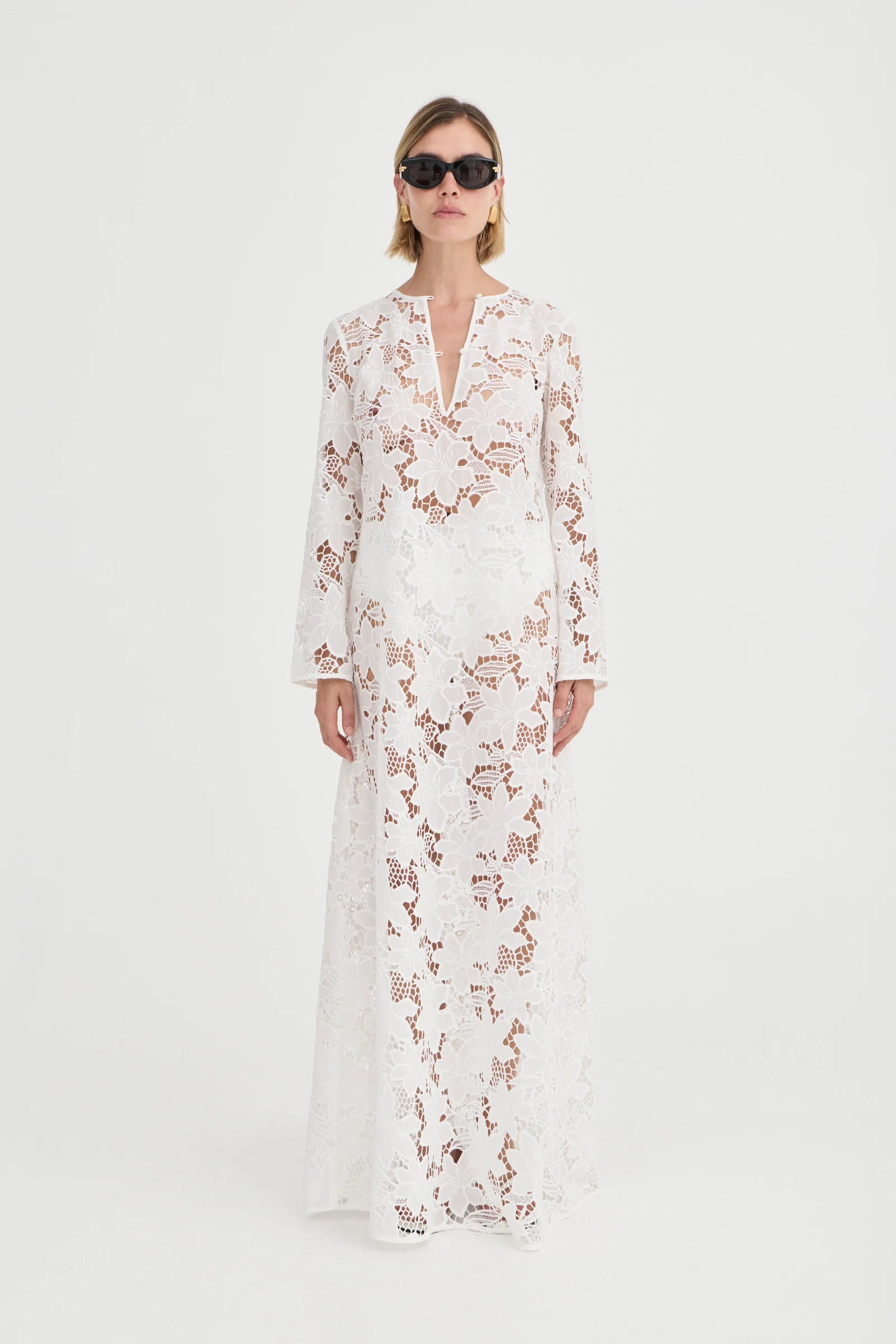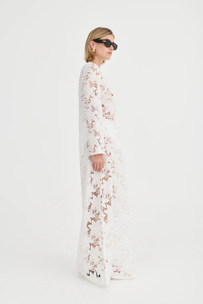 Romantic and refined, the Palma Kaftan is crafted from intricate white floral lace, creating a striking silhouette that is both elegant and effortless. The deep V-neckline frames the décolletage beautifully, while the semi-sheer finish showcases the delicate artistry of the lace. Falling into a floor-grazing hem, the fluid shape moves with ease, evoking a sense of timeless grace.